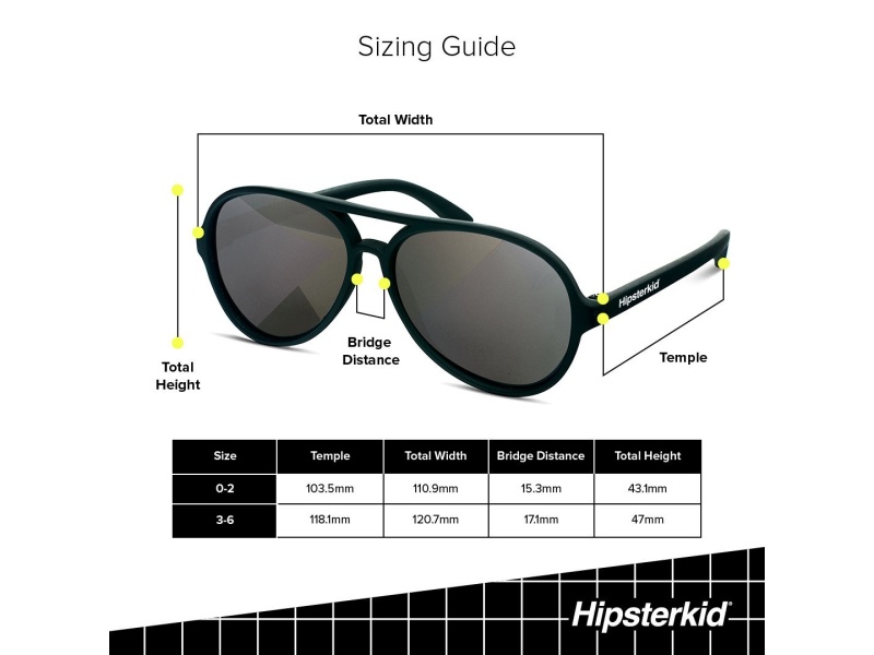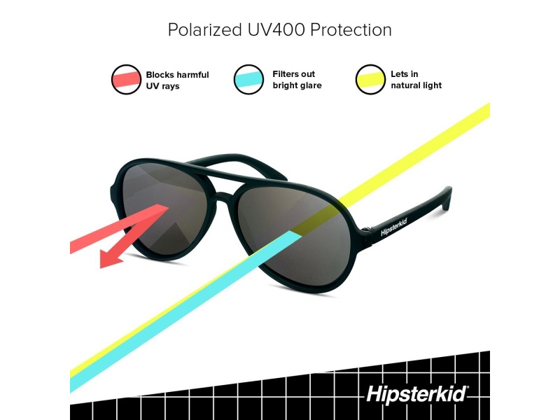 Hipsterkid polariseeritud UV 400 kaitsega päikeseprillid võimaldavad beebidel ümbrust nautida ilma silmi kahjustamata. Päikeseprillid on kerged ja arvestavad lapse kasvava peaga.