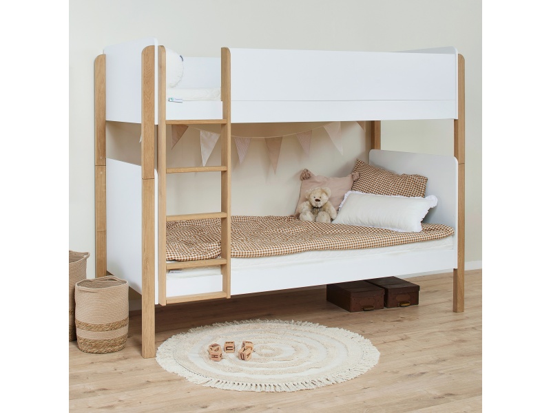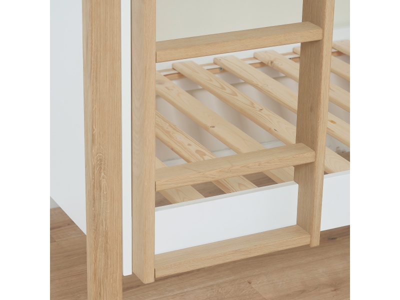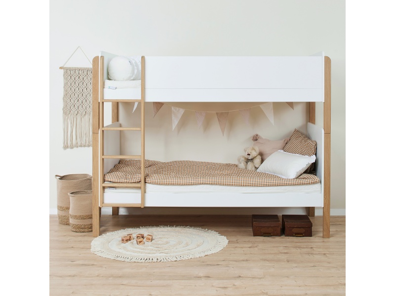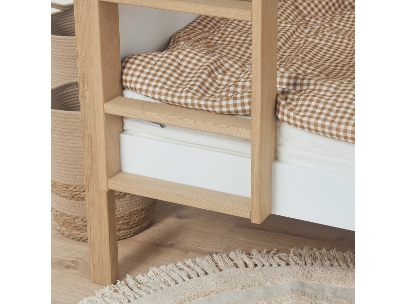 Avasta elegantne narivoodi, mis ühendab endas funktsionaalsuse ja ajatu disaini. Voodi on valmistatud MDF-materjalist, mis tagab vastupidavuse ja tugeva konstruktsiooni. Jalad ja redel on valmistatud kaunist tammepuust, lisades voodile ja toale loomulikku soojust.