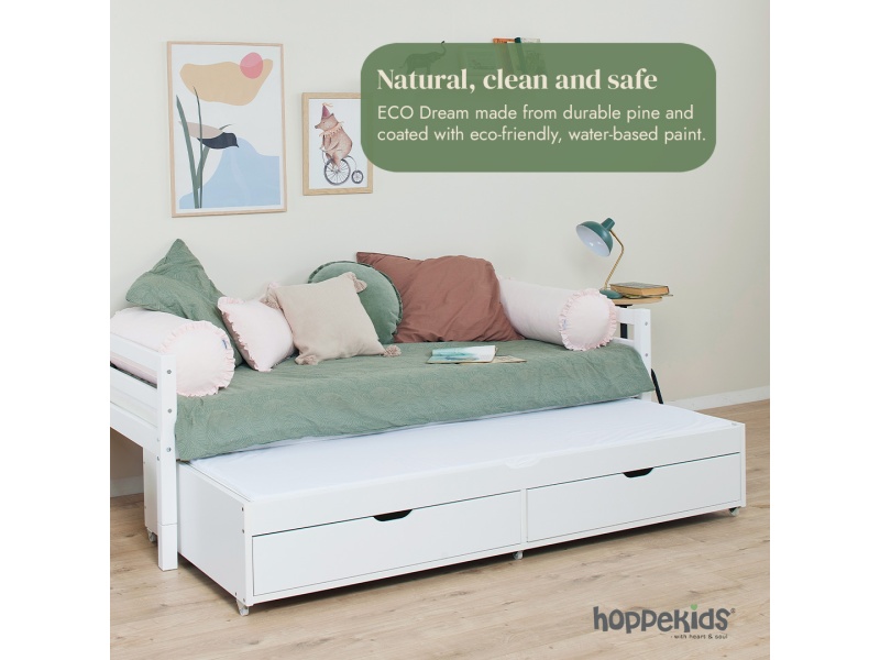 Lisavoodi koos panipaigaga Lisavoodi koos sahtlitega muudab selle mööblieseme eriti funktsionaalseks. Voodi on valmistatud sertifitseeritud puidust ning sobib disaini ja viimistluse poolest ideaalselt Eco Dream üheinimesevoodiga. See pakub lisamagamisruumi mõõtmetega 90×190 cm ning lisapanipaika, mida saab mugavalt välja tõmmata ja tagasi lükata, kui seda parasjagu ei kasutata. Ideaalne lahendus ööbivatele külalistele, mängukaaslastele või õdedele-vendadele, kes jagavad tuba.