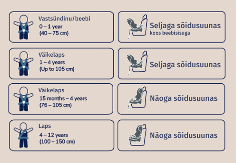 - Seljaga sõidusuunas kuni 4. eluaastani – tagab lapsele parima kaitse võimalike kokkupõrgete korral