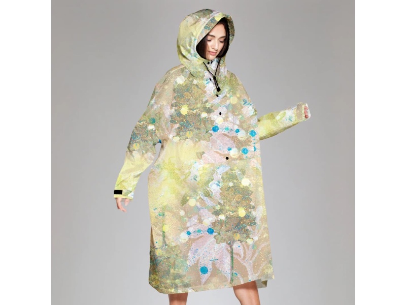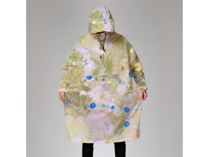 Flora Rain Poncho tähistab looduse imelisust, põimides värvi, kuju ja ruumi mängu kaudu kokku keerukaid taimemotiive. Lähemalt vaadates avastad peidetud botaanilisi detaile, mis annavad disainile elu.
