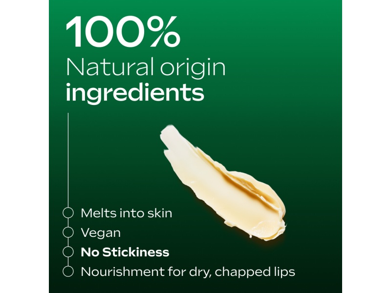 Toitev ja looduslik kaitse kuivadele ja õrnadele huultele. Siidine pehmus, täiuslik niisutus ja loomulik läige. Kolmekordse päästeeffektiga huulepalsam toidab teie huuli looduslike õlide ja vahadega, rahustades ja parandades kuivi huuli. Ei jäta huuli kleepuvaks. 100% looduslikud koostisosad. Dermatoloogiliselt testitud.