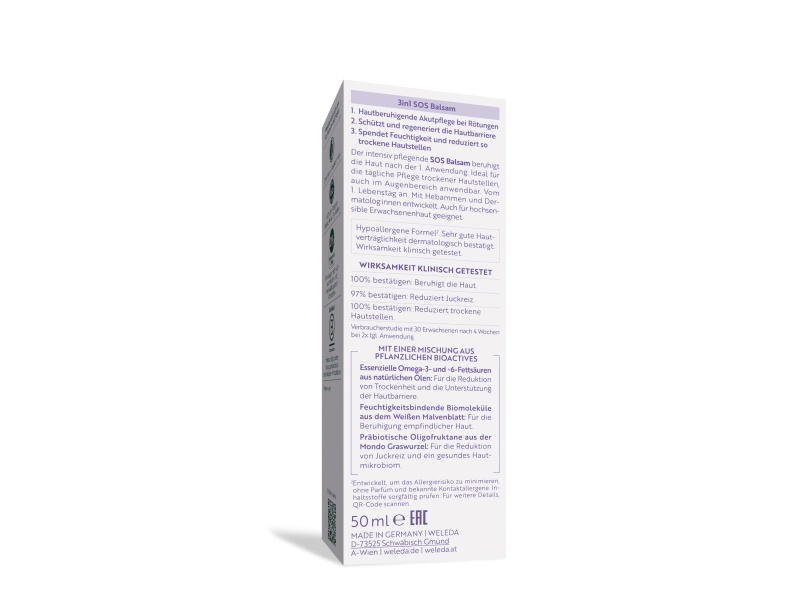 Weleda Valge Kassinaerise 3 in1 SOS palsam pakub õrna ja tõhusat hooldust eriti tundlikule, kuivale ja atoopilisele nahale ning rahustab nahka juba esimesel kasutuskorral. See rahustav kreem on spetsiaalselt välja töötatud väga tundlikule ja kuivale nahale mis vähendab naha kuivust ja punetust ning pakub kohest leevendust sügelevatele ja kuivadele laikudele. Ohutu kasutada alates esimesest elupäevast.